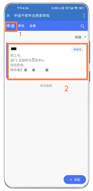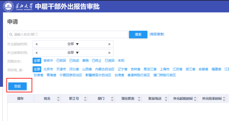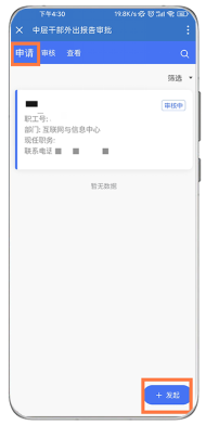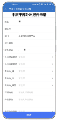 在“申请”项选择“发起”,在“中层干部外出报告申请”中填写相关信息。填完后,点击页面底部的“申请”提交申请。(*标记项必填项),注:您可能需要上下划动屏幕。