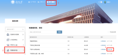 方式二:登入韦德体育bevictor办事大厅(点击此处可直接访问),选择“部门服务”→“党委组织部、党校”→“干部外出报告审批”,选择在线办理。