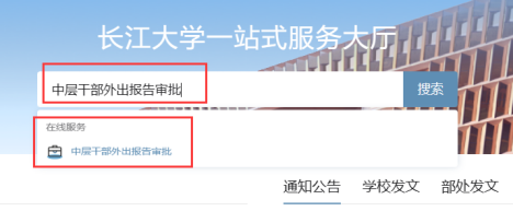 方式一:登入韦德体育bevictor办事大厅(点击此处可直接访问),在搜索栏输入“中层干部外出报告审批”进入微服务,见右图所示。