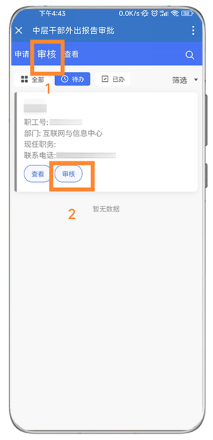 方式一:进入应用后,选择“审核”菜单,点击需要审核的记录进行审核。 |